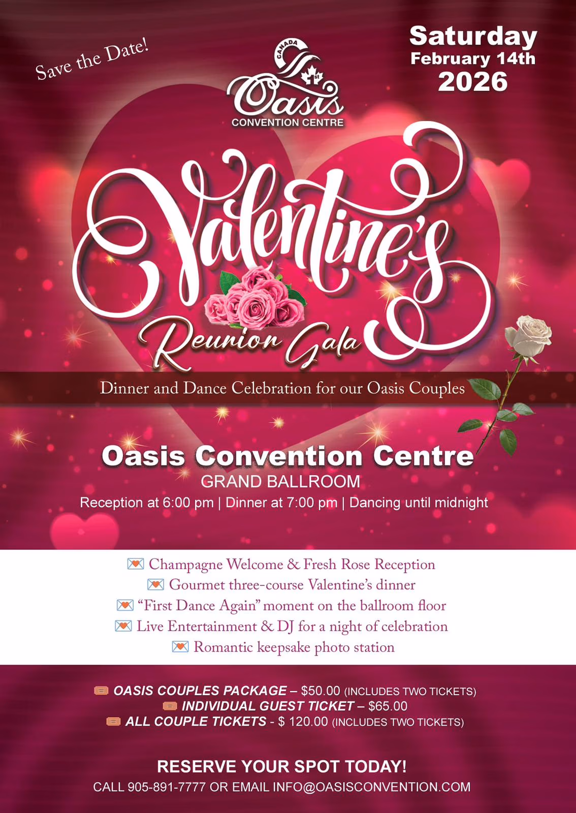 Join us for an unforgettable Valentine’s Reunion Gala — a romantic evening filled with love, laughter, and celebration. Whether you’re returning to Oasis where your story began or creating new memories together, this is a night designed to truly Experience the EXTRAordinary.